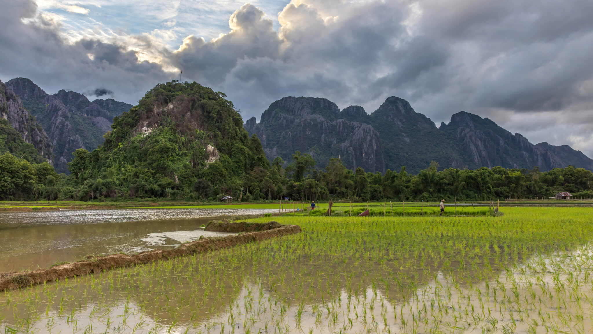 Attribution-Share Alike 4.0 truetrue English Green paddy fields and karst mountains at sunset with clouds in Vang Vieng Laos Wikimedia username: Basile Morin URL: