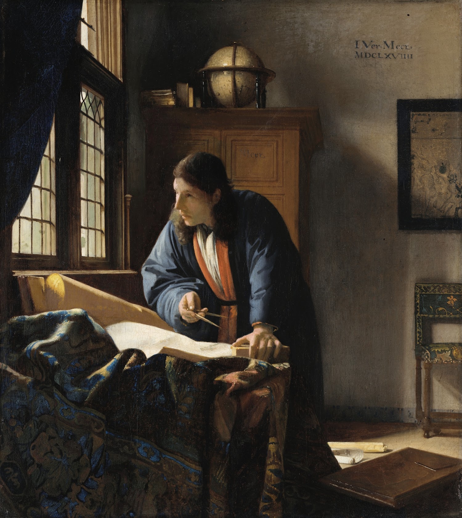 Johannes Vermeer painted ‘The Geographer’ around 1669. The painting depicts a man absorbed in study, highlighting the era’s explorative spirit. Vermeer effectively utilizes natural light and detailed textures to create a sense of realism and depth, characteristic of his works.