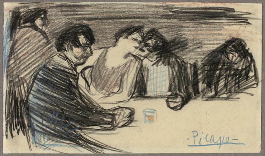 This is a sketch by Pablo Picasso depicting a group of people in a cabaret setting. The figures are drawn with dark lines and the overall tone is monochromatic.