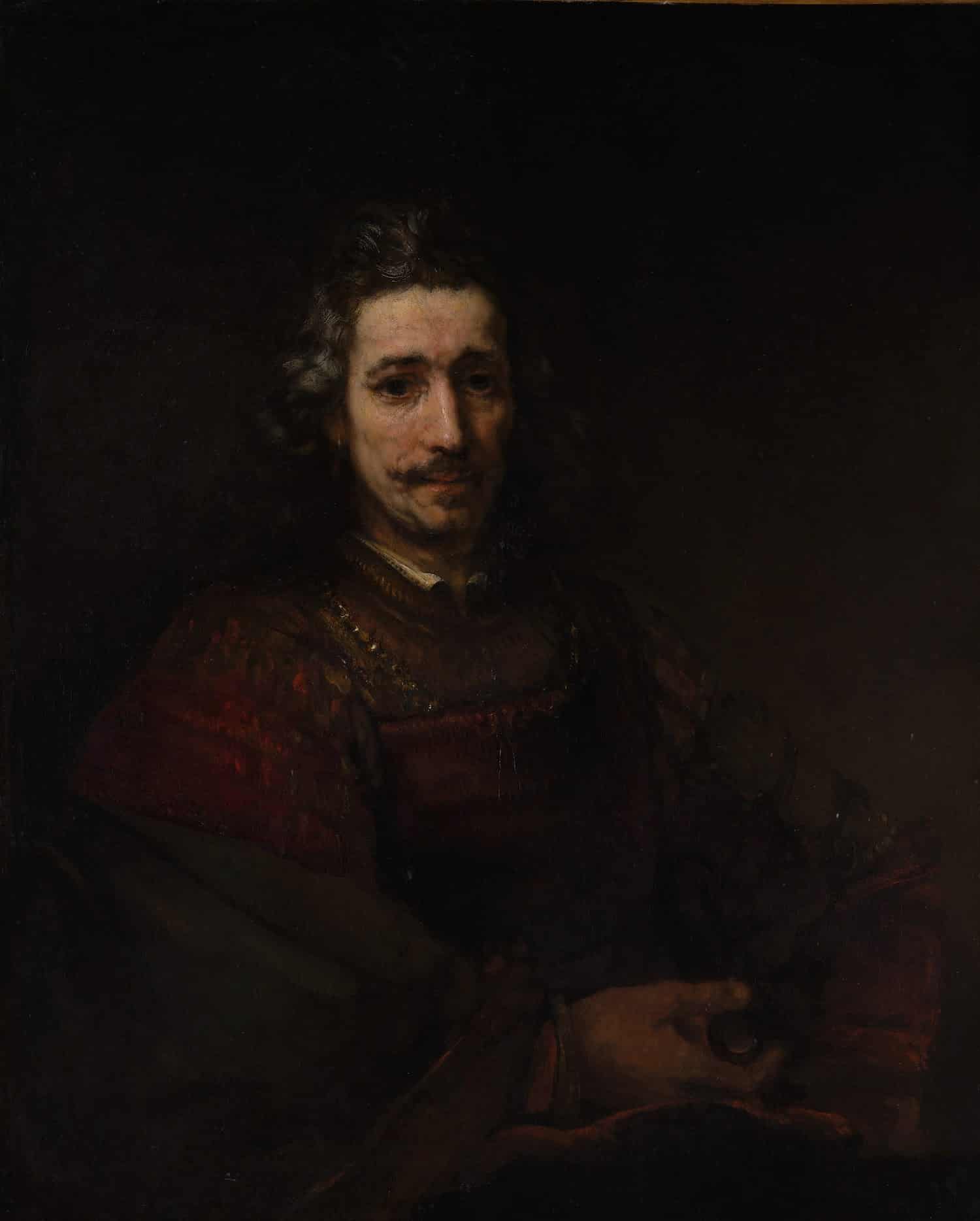 Rembrandt’s ‘Man with a Magnifying Glass’ around 1660-1665. Known for his profound understanding of human nature and skill in capturing the depth of human emotion, Rembrandt’s works often feature a masterful use of light and shadow. This painting is notable for its dark, moody background which emphasizes the introspective expression of the subject, showcasing Rembrandt’s ability to create a sense of intimacy and depth.