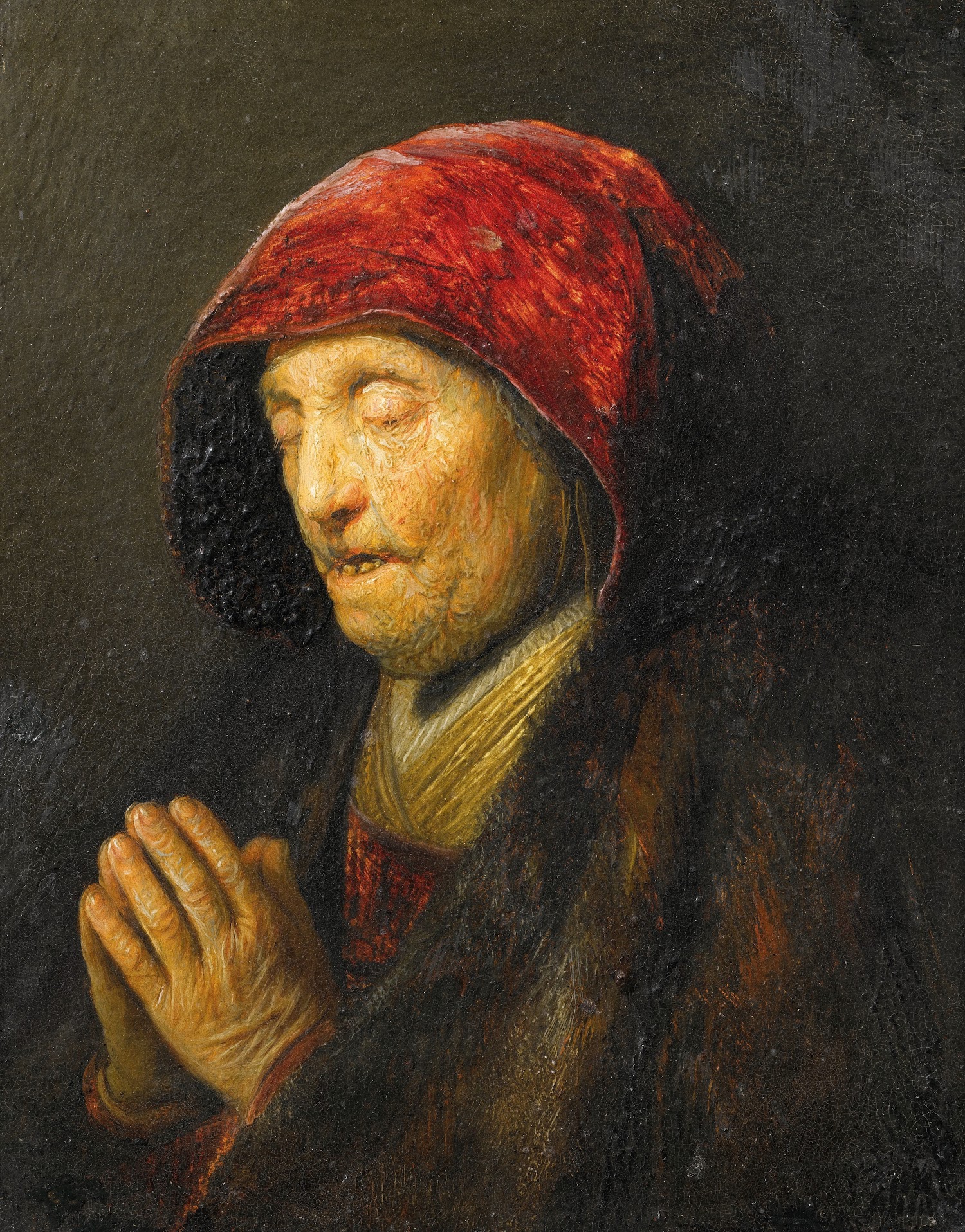 Tags: 1629_1630, Brown, oldwomanpraying, Painting, Public_domain, Red, Rembrandt