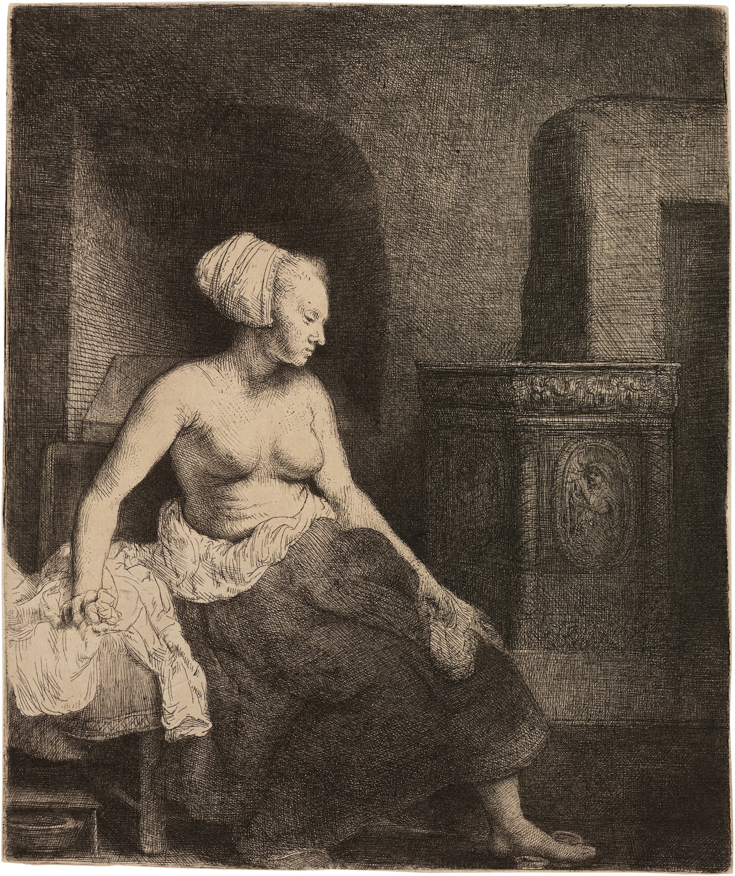 Rembrandt van Rijn, a master of Dutch Golden Age painting, produced ‘Woman Sitting Half-Dressed Beside a Stove’ around the mid-17th century. This etching exudes Rembrandt’s exceptional ability to capture human emotion and light. The depiction of the woman, partially undressed and in a candid pose beside a stove, reflects the domestic life and realism that Rembrandt often portrayed.