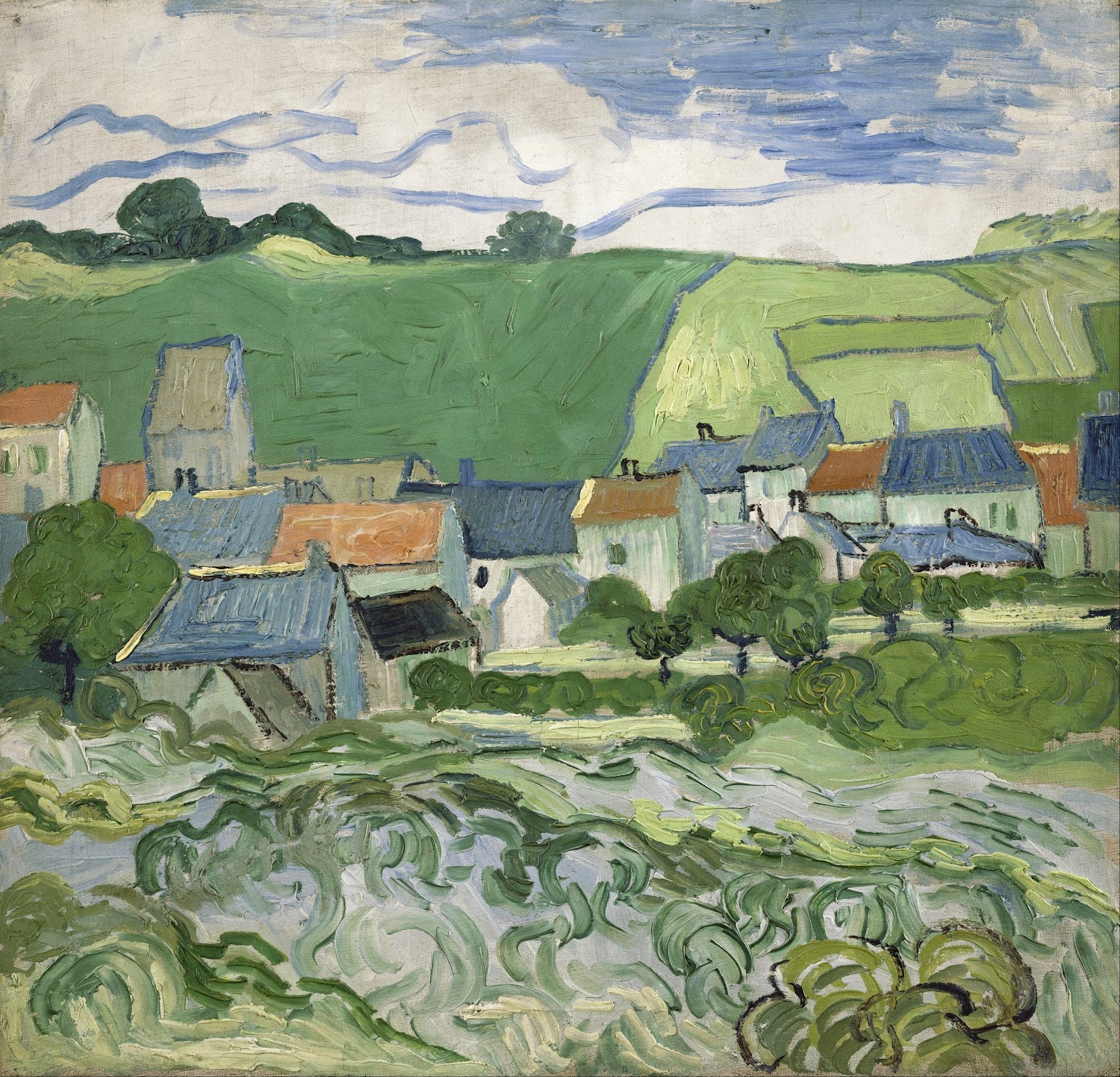 Vincent van Gogh’s ‘View of Auvers’ is a landscape painting created in July 1890, during the final months of his life. This work captures the picturesque village of Auvers-sur-Oise, a small town north of Paris where van Gogh spent the last few months before his death. The painting features vibrant, swirling colors and dynamic brushstrokes characteristic of van Gogh’s style. It depicts lush greenery and rustic cottages under an expressive, swirling sky, reflecting van Gogh’s emotive connection to the landscape. The painting is part of his passionate output during his turbulent final weeks, showcasing his unique and poignant connection to the world around him.